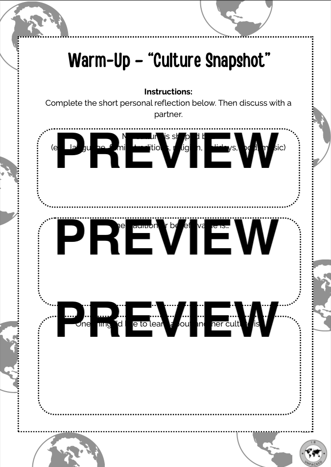 The lesson begins with a warm-up called “Culture Snapshot.” Students reflect on what shapes their identity. From food and family traditions to language, religion, and music, and then share one thing they’d like to learn about another culture